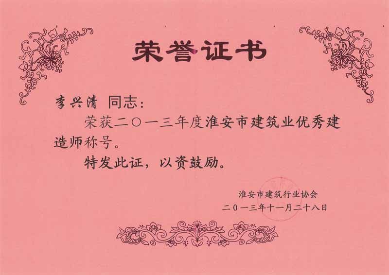 2013年度淮安市建筑业优秀建造师-李兴清