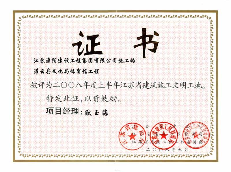 2008年省文明工地-灌云县文化局体育馆工程-耿玉海
