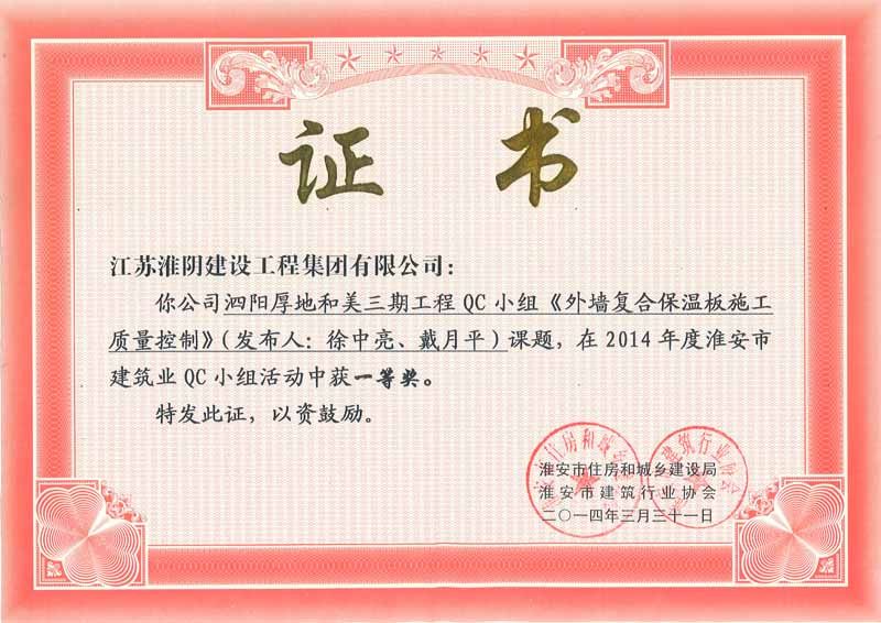2014年度QC一等奖泗阳厚地和美三期工程《外墙复合保温板施工质量控制》徐中亮、戴月平